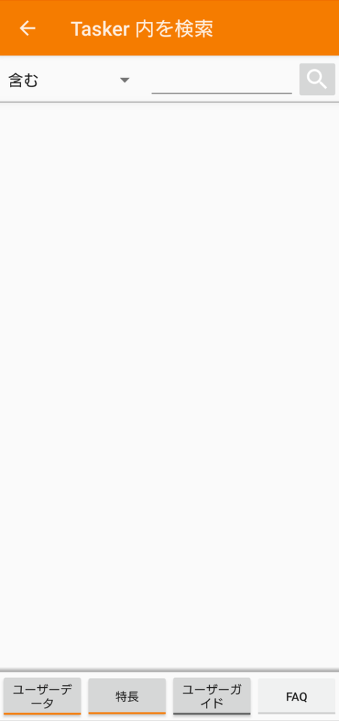 アクションバー右上にある虫めがねのアイコンをタップすると検索画面が表示され、Tasker内を検索すること画出来ます。